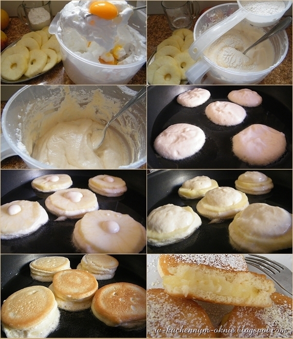 Wykonanie:Jabłka obieramy, kroimy w talarki o grubości ok. 7 mm. Usuwamy gniazda nasienne.Białka ubijamy mikserem na sztywną pianę.Pod koniec ubijania dodajemy oba cukry i sól. Dajemy po 1 żółtku i dalej ubijamy.Odstawiamy mikser i wsiewamy mąkę mieszając łyżką.Natychmiast na rozgrzany olej kładziemy małymi porcjami ciasto (patrz ostatnie zdjęcie)Gdy trochę podrośnie kładziemy talarki jabłek, a na nie niewielkie porcje ciasta.Smażymy na złoty kolor z obu stron. Podajemy posypane cukrem pudrem.Najsmaczniejsze są zaraz po usmażeniu.